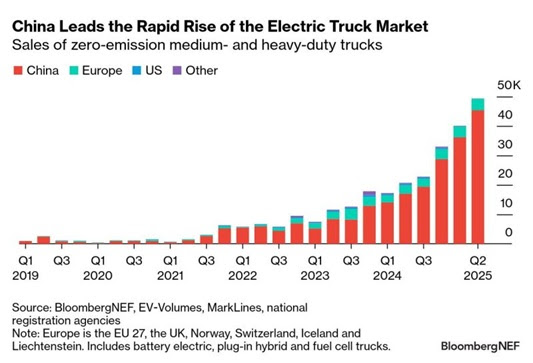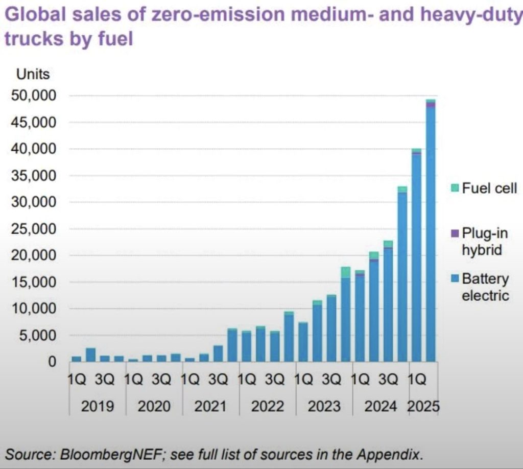 EV truck sales are surging globally while hydrogen truck sales have slowed.